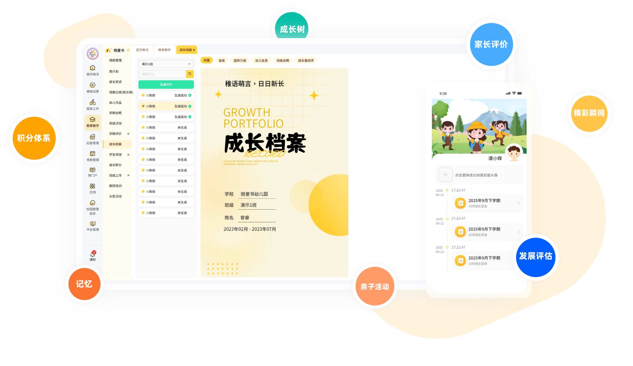 微童书联通园所与家庭,以孩子成长陪伴为导向,通过家长和老师的互相配合,附以积分激励体系,让家长更主动的融入到孩子成长过程中。成长点滴将记录进成长档案,留住孩子在这段时光的独家记忆,让远方的老人也能随时关注孩子成长,让老人更放心