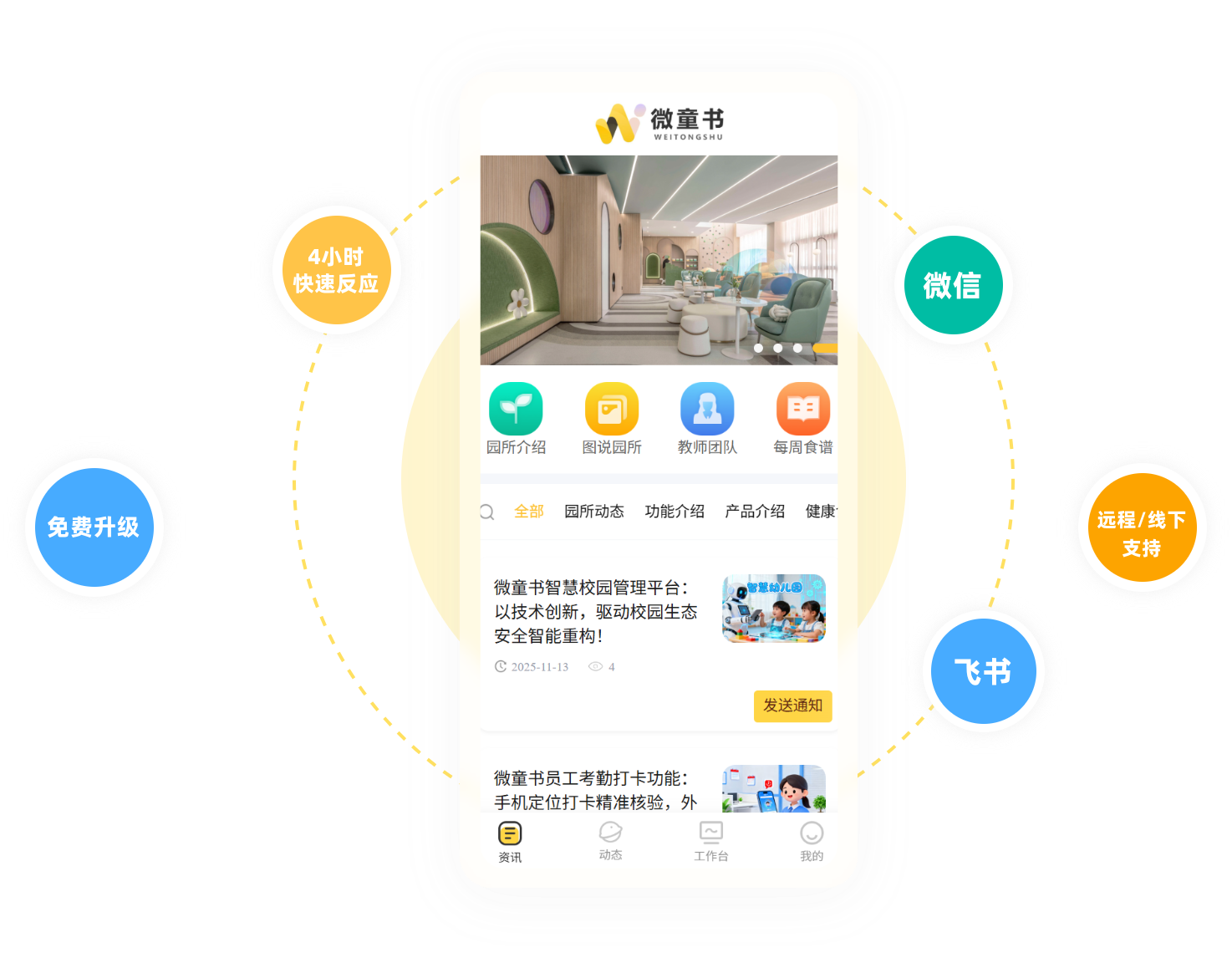 微童书拥有完善的售后服务保障,不仅在线上提供技术保障,4小时快速反应机制快速解决问题。线下支持服务更遍布各省市。微童书会对幼儿园的使用情况进行定期回访,与园所经营者进行探讨与交流,对系统进行升级和优化,匹配客户不断变化的需求