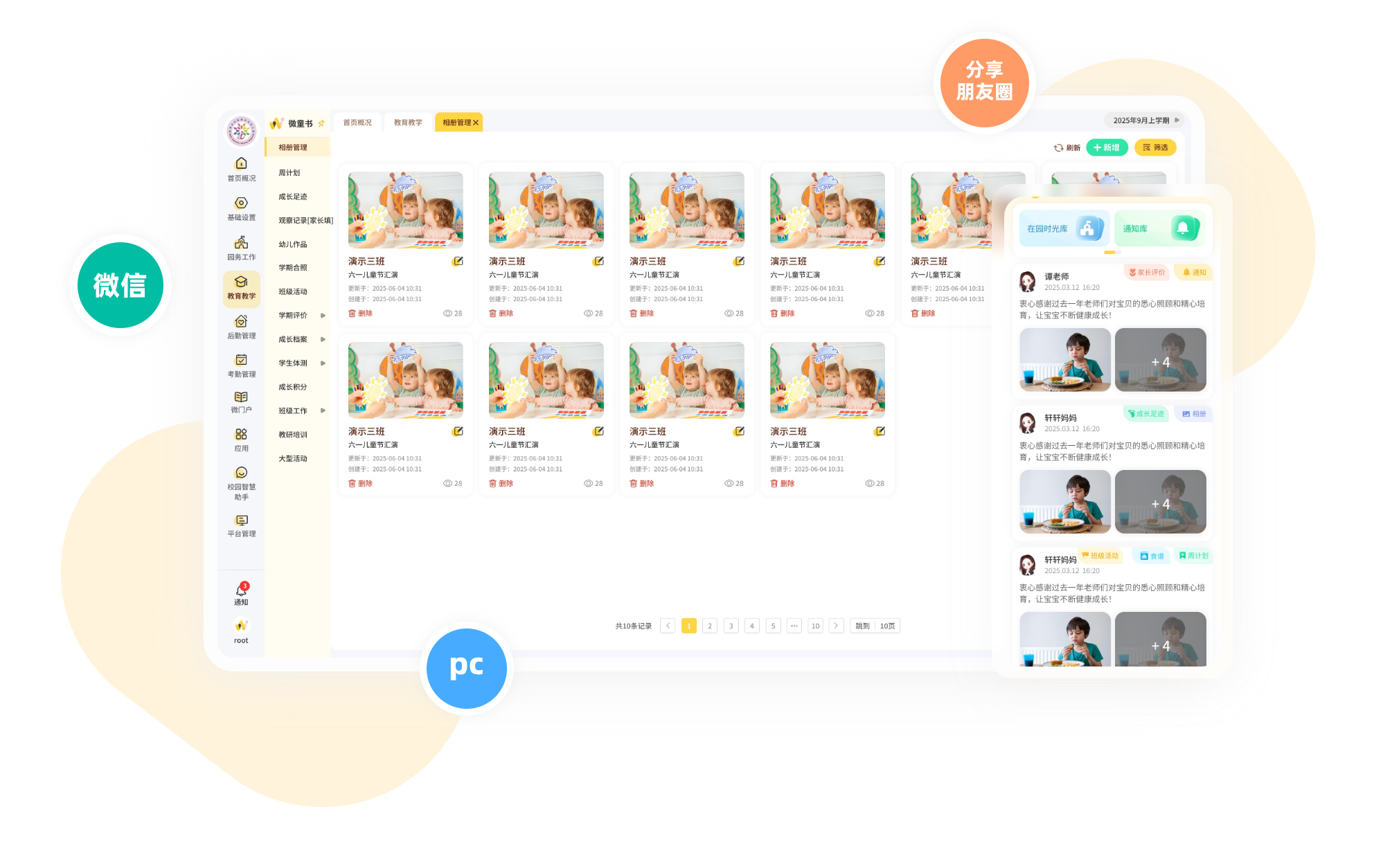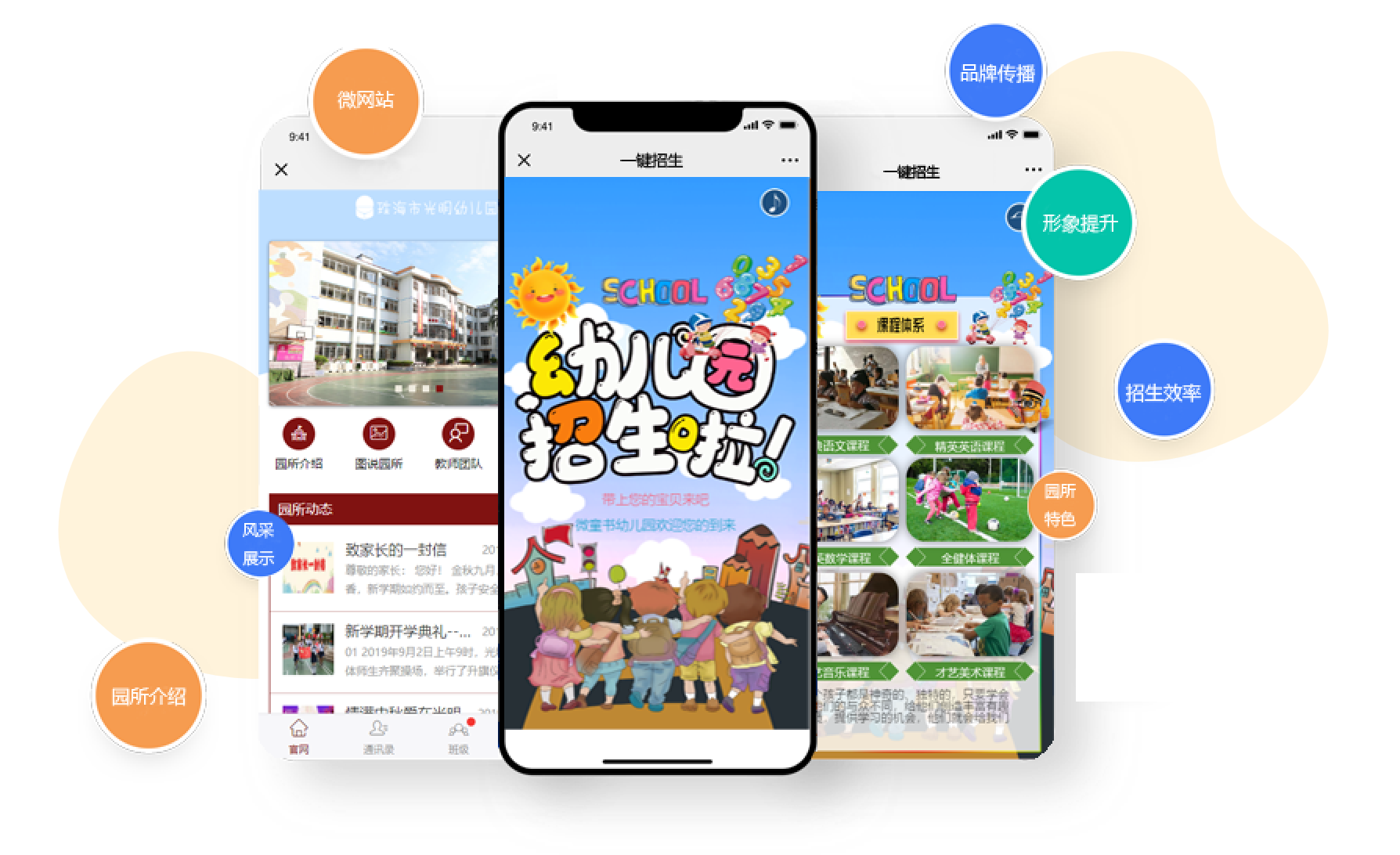 微童书帮助园所搭建微官网,展现幼儿园教学理念、特色课程、精彩活动等园所风采,帮助幼儿园提升品牌形象和家长口碑。一键招生功能和育儿社交的相册分享,可以全方位提升园所媒体传播发声效率,解决园所招生难题