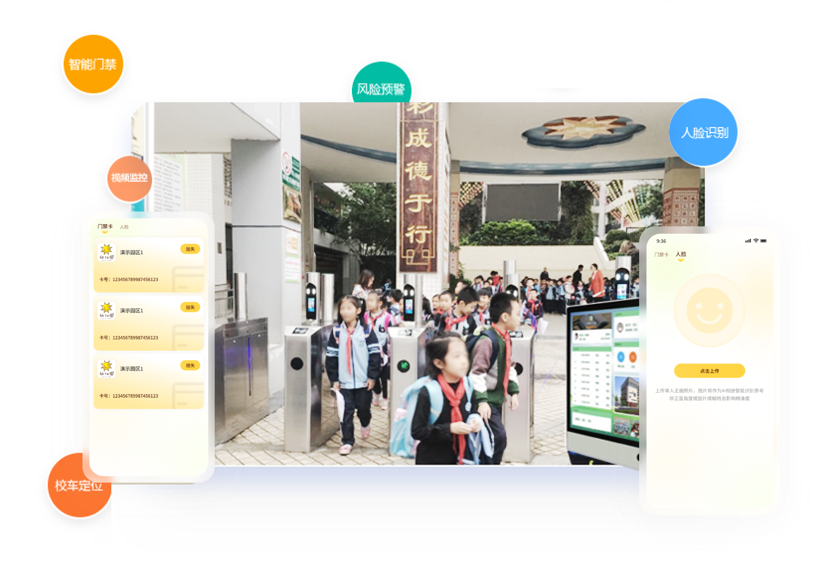 基于业内领先的幼儿园安全标准,悉心打造幼儿园孩子从进到出360°无死角安全防护,给孩子最周全的保护。通过智能门禁、智能班牌、视频监控、校车定位等能力,有效提高幼儿园安防水平。通过人工智能风险智能预警功能,园长和负责人可以第一时间发现园所风险(孩子体温预警、烟火预警等),园内安心,家长放心