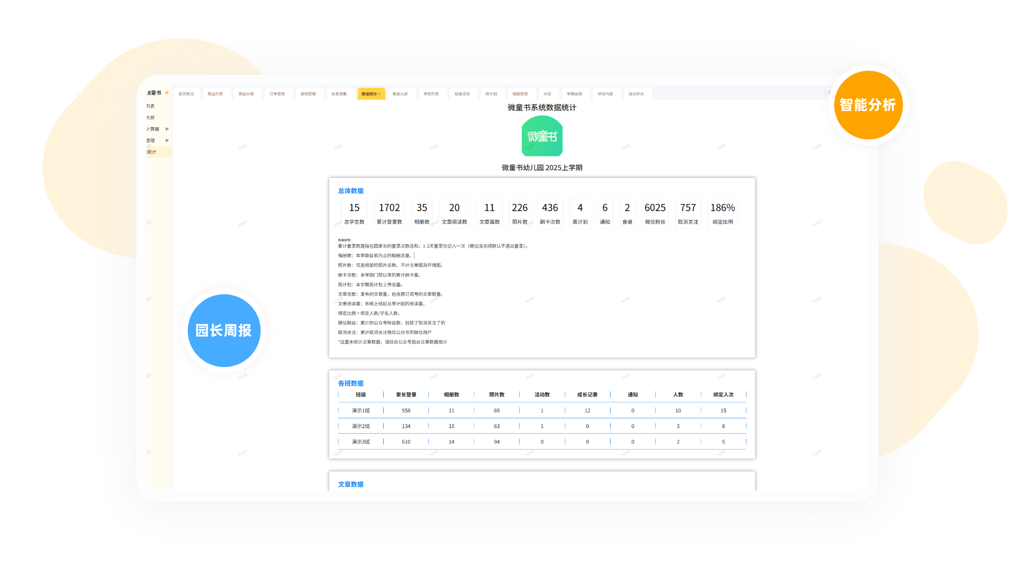 微童书可以对全维度数据记录分析,可以自定义多种核心分析指标,通过智能经营分析大屏可以让园所即时准确的掌握园内经营情况。园长和负责人可以每周自动收到周报信息,可以自定义推送周报的核心指标,让园所经营管理更加轻松
